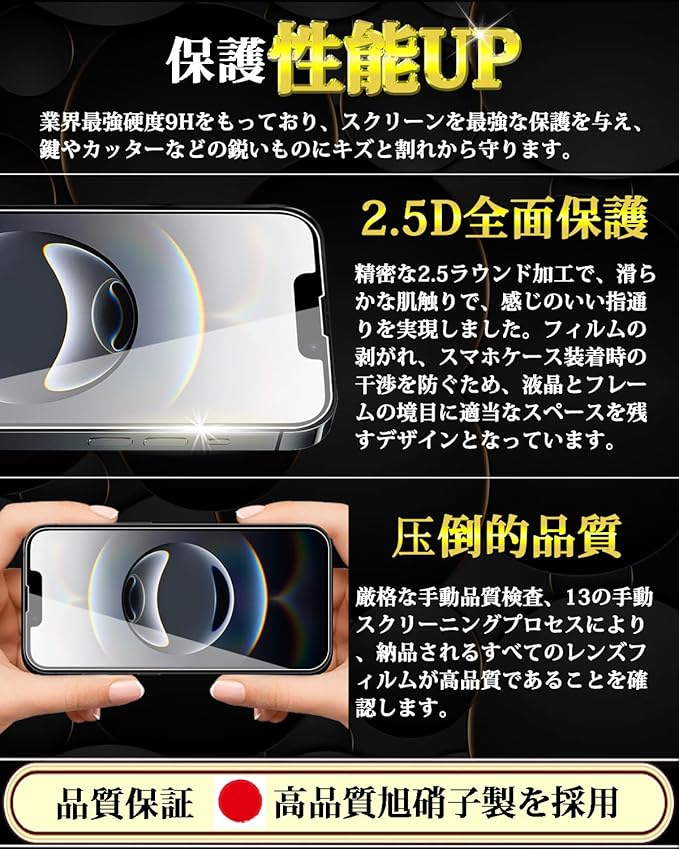 【日本製素材旭硝子製】iPhone 16e/14/13/13pro ガラスフィルムは日本製旭硝子ガラスを使用し、表面硬度9Hなので、キズが付きにくい保護フィルム。ナイフや鍵などの尖ったものでも簡単には傷がつきません。万が一ガラスフィルムが破損した際にガラス片が飛散しない飛散防止処理も施されています。フルカバーデザインでサイドからの衝撃を和らげ、縁まで携帯電話のスクリーンを守っていきます。
