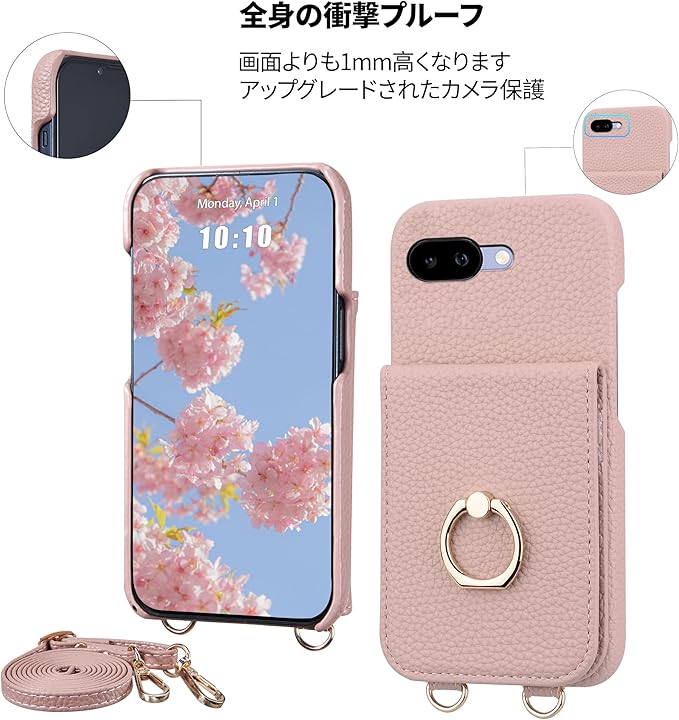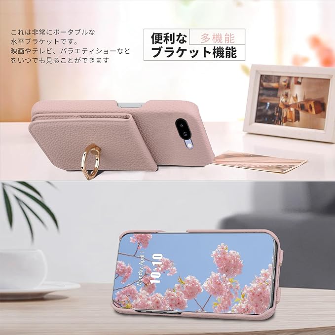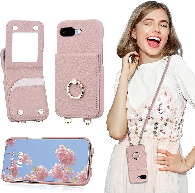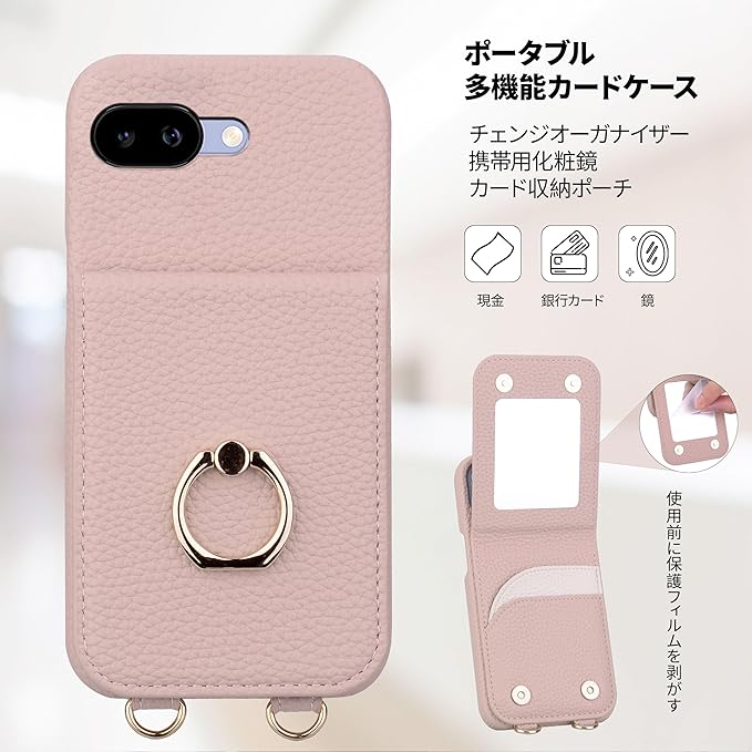 For Google Pixel 9A ケース 手帳型 グーグルピクセル9A ケース ショルダー Googleピクセル9A ケース 手帳型 肩掛け 斜め掛け(長さ調整可能) 背面カード収納 化粧鏡付き スタンド機能(リング付き) Pixel 9A カバー ミラー付き (スモーキーピンク)