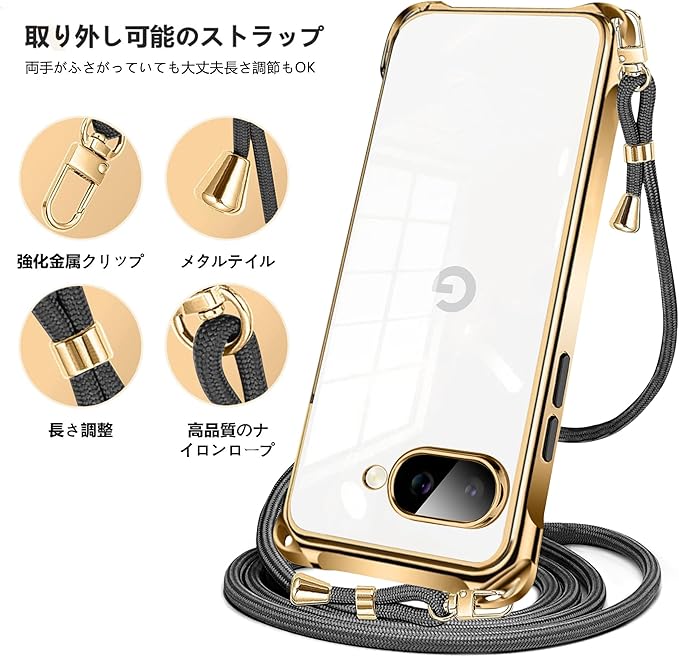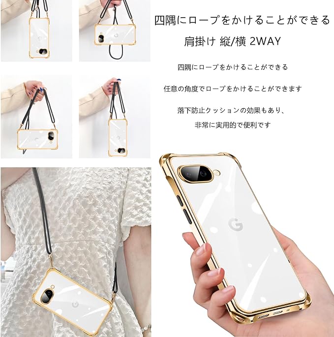 PAILAIMEN Google Pixel 9a ケース クリア ネック ショルダー pixel 9a ケース 耐衝撃 対応 ピクセル9a スマホケース 肩掛け 斜めかけ 縄掛け カバー メッキ加工 透明 TPU 薄軽型 ストラップ付き 携帯ケース ネックストラップ ショルダー 肩掛け 長さ調整可能 取り外し可能 落下防止 擦り傷防止(ゴールド)