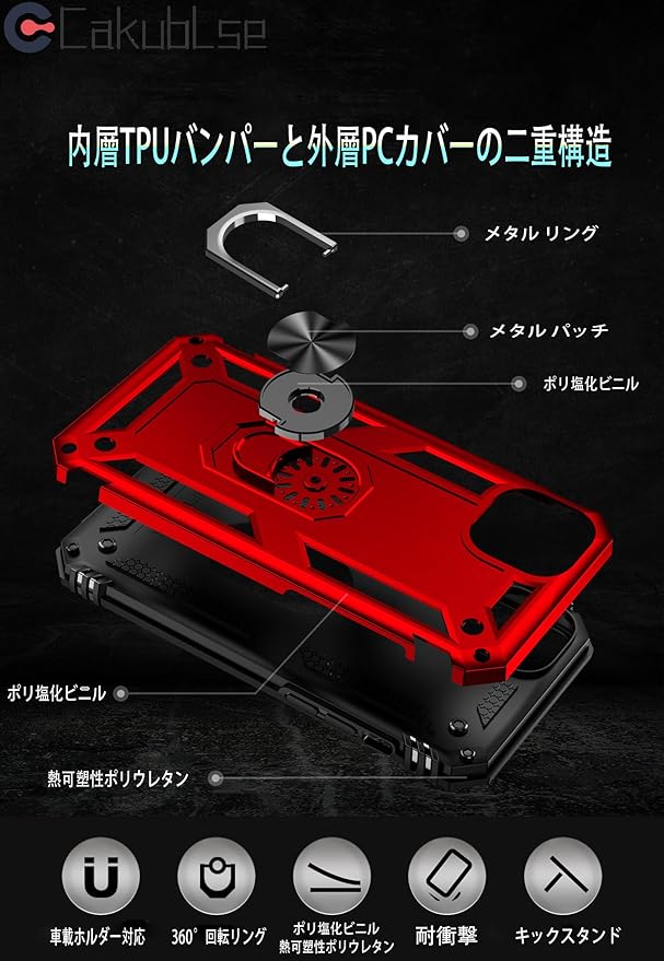 Cakublse スマホケース iPhone 15 ケース 耐衝撃 リング スタンド iPhone15ケース iPhone15 アイホン アイフォン iPhoneケース 15 ケース カバー Case バンパー リング付き リング付きケース レッド 赤