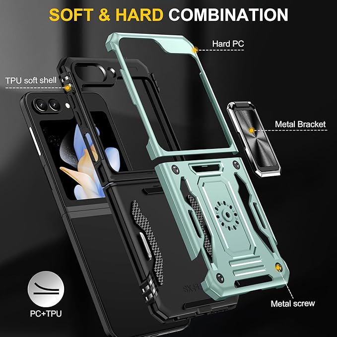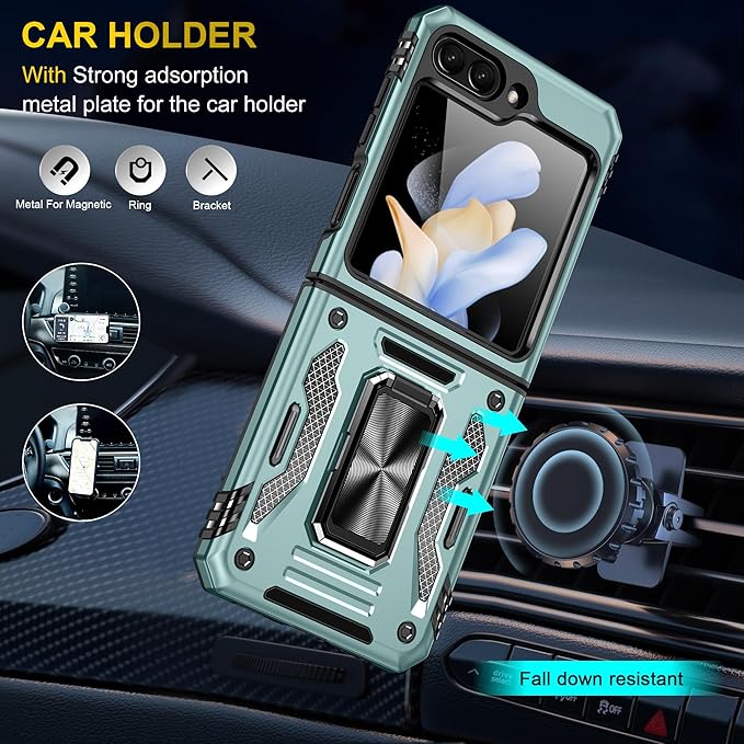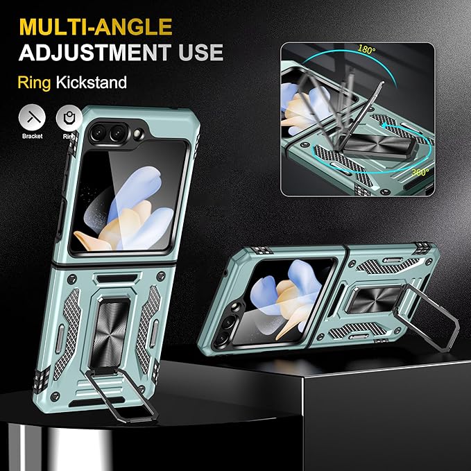 Galaxy Z Flip5 用ケース リング付き スライド式カメラカバー 耐衝撃 スタンド機能 車載ホルダー レンズ保護 ギャラクシー Z フリップ5 用スマホケース PC TPUバンパー 防塵 人気 落下防止 滑り止め 指紋防止 携帯カバー 緑 K83