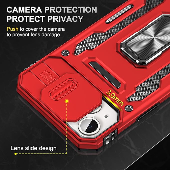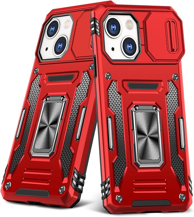iPhone 15 Plus 用 ケース リング付き スライド式カメラカバー 耐衝撃 スタンド機能 車載ホルダー レンズ保護 アイホン15プラス スマホケース PC TPUバンパー 防塵 人気 落下防止 滑り止め 指紋防止 携帯カバー 赤 K96