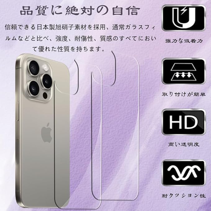 対応 iPhone 15 pro 背面フィルム iPhone15 Pro ガラスフィルム 【日本製素材旭硝子製】アイフォン15 Pro 背面保護フィルム iPhone15 Pro 6.1''強化フィルム 高硬度9H 指紋防止 さらさら 気泡防止 飛散防止 撥油性 耐衝撃 高 透過率【2枚セット】