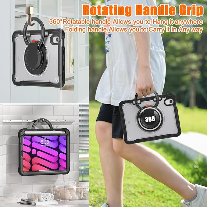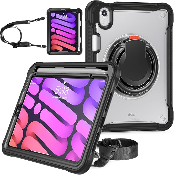 縦置き 横置き iPad Mini6 iPad Mini7 ケース 肩掛け 360 回転持ち手 ペン収納 iPad mini 第6世代 / iPad mini A17 Pro カバー ショルダーストラップ付き ハードPC +シリコン リングスタンド 耐衝撃 半透明 背面カバー つや消し 黒)