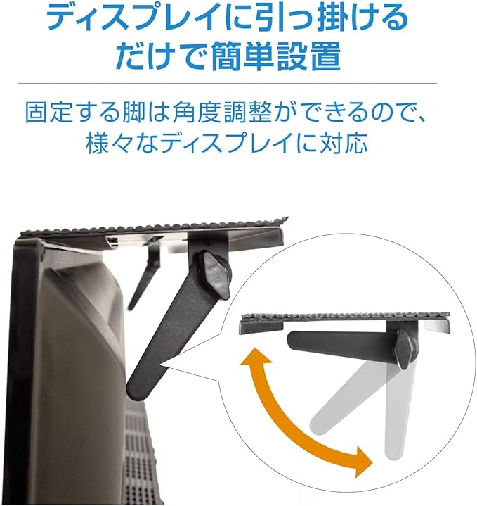 【工具不要で取り付け簡単】ネジなどの工具を使う必要がないので、設置作業が苦手な人でも簡単に取り付けられます。ボードを固定する脚を角度調整するだけで、様々な厚みのモニターに対応することができます。