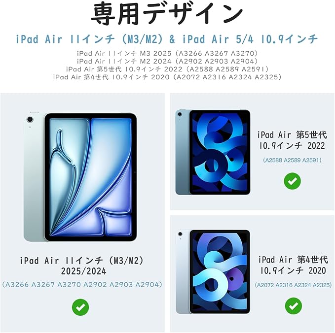 「iPad Air 11インチ/5世代 4世代 10.9インチ ケース」2024年発売のiPad Air 11インチ(M2)(モデル番号:A2902、A2903、A2904)、2022年発売のiPad Air 5(モデル番号:A2591、A2588、A2589)と2020年発売のiPad Air 4(モデル番号:A2316、A2324、A2325、A2072)に適用します。iPad 第10世代 10.9インチ、iPad Air 13インチ、又は他のモデルには適用しません。ご購入前に、機種・モデル