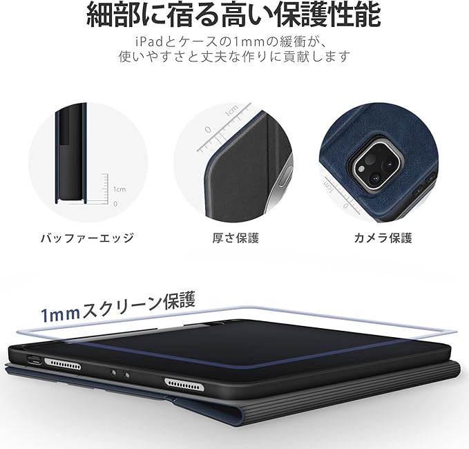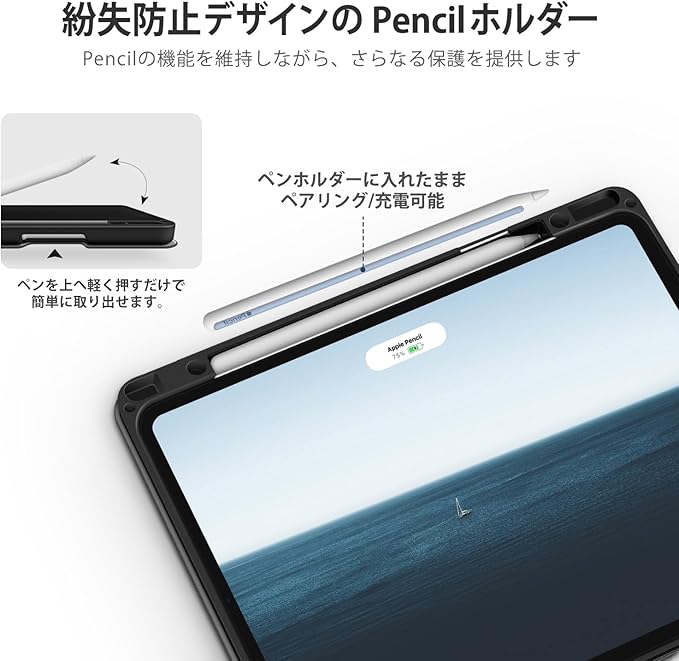 2、【紛失防止のペンホルダー】12.9インチiPad用のApple Pencilスロットが内蔵されており、これを使えば、ペンをしっかりと保管し紛失を避けることができます。ペンホルダーに入れたままApple Pencilのペアリングとワイ