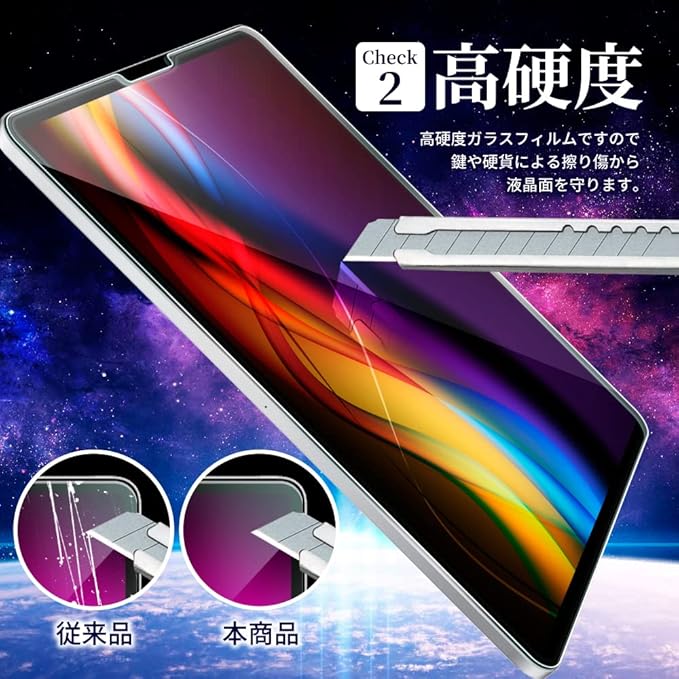 【ナイフでも傷つかない】硬度9H以上でカッターナイフでも傷付かない高強度の強化ガラスフィルム最先端技術で製造しており、「より割れない」「より浮かない」「角割れしない」ガラスフィルムです