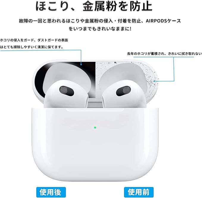【対応機種】AirPods 3に適合する(2021年10月発売)。パッケージ内容:AirPods 3用ダストガード*2ペア、アルコールワイプセット*2。