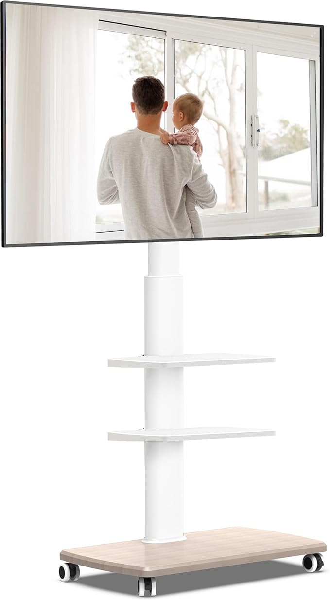 FITUEYES テレビスタンド 32〜70型対応 キャスター付き 高さ角度調節可能 移動式 木目調 ホワイト 中段棚二枚付 棚板無階段調節 TT306504WW