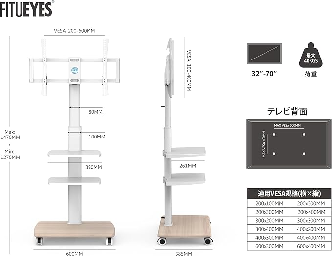 ?【VESA規格対応】汎用性の高いVESA規格(テレビ背面のネジ穴間の距離)対応、最小限は20×10cm、最大限は60×40cmです。当製品が32~70インチのテレビやモニター(40kg相当)に適応します。