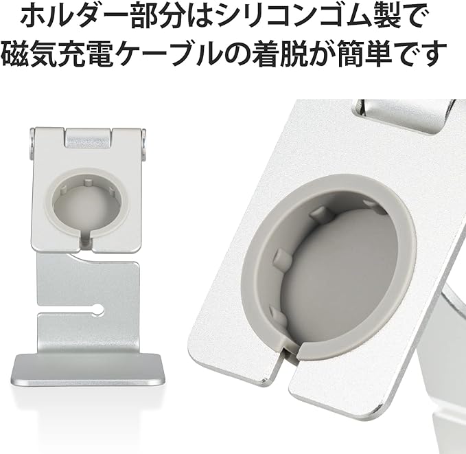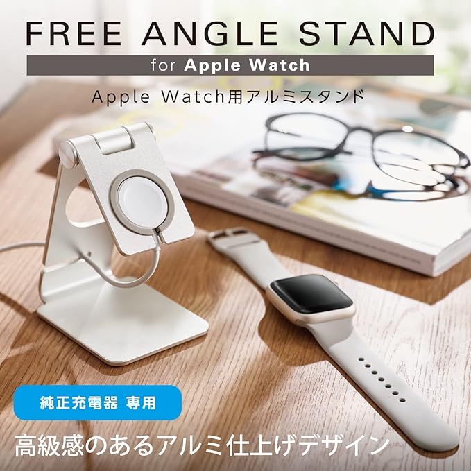 純正Apple Watch磁気充電ケーブルを装着・接続することでApple Watchの設置と充電ができ、ホルダー部は角度調整ができるフリーアングルスタイルのApple Watch用アルミ製スタンドです。
