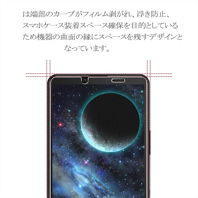 『対応機種』 Xperia 10 IV (SO-52C SOG07)専用。携帯は端部のカーブがフィルム剥がれ、浮きの防止、スマホケース装着スペース確保のため、機器の曲面の縁にスペースを残すデザインとなっています。