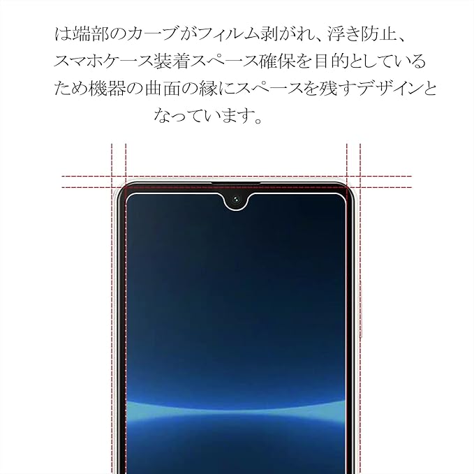 『 対応機種 』Xperia ACE III (SO-53C SOG08) に適応しています。携帯は端部のカーブがフィルム剥がれ、浮きの防止、スマホケース装着スペース確保のため、機器の曲面の縁にスペースを残すデザインとなっています。