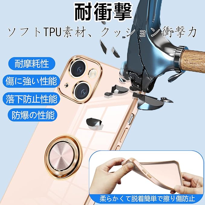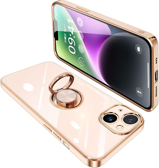 iPhone14 ケース リング付き アイフォン14 リング カバー 耐衝撃 TPU 360°回転 スタンド機能 メッキ加工 車載ホルダー ストラップホール付き 6.1インチ(ピンク)