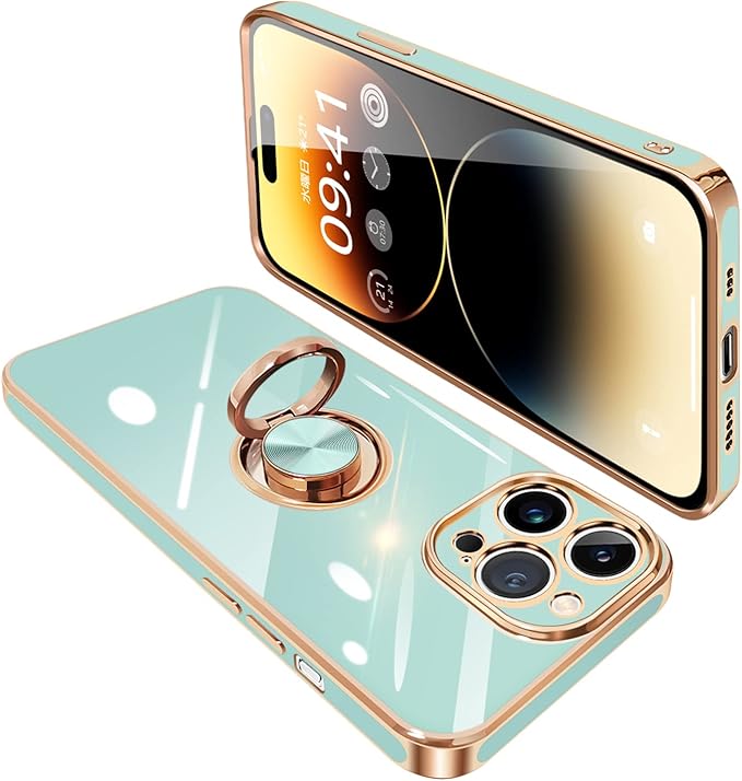 iPhone14 Pro ケース リング付き アイフォン14Pro リング カバー 耐衝撃 TPU 360°回転 スタンド機能 メッキ加工 車載ホルダー ストラップホール付き 6.1インチ(ライトシアン)