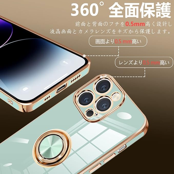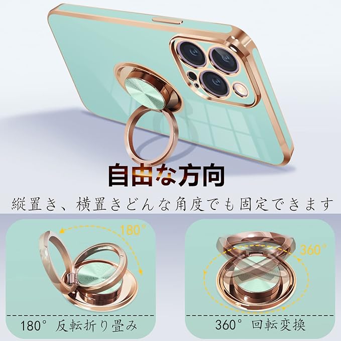 iPhone14 Pro ケース リング付き アイフォン14Pro リング カバー 耐衝撃 TPU 360 回転 スタンド機能 メッキ加工 車載ホルダー ストラップホール付き 6.1インチ(ライトシアン)