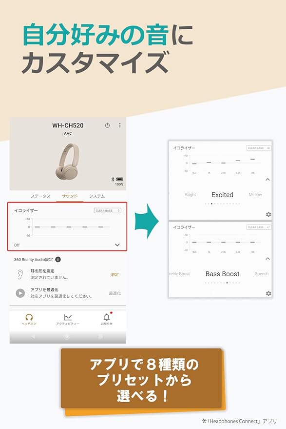 専用アプリ「Headphones Connect」に対応しており、お好みの音質にカスタマイズする事ができる「イコライザー」を使うことで「Relaxed」や「Bass Boost」など8種類のプリセットから選択したり、お好みのイコライザー設定にカスタマイズしたりすることが可能です。