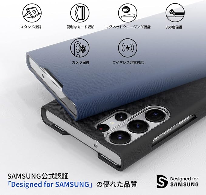 【便利なカードポケット付き、見やすい角度のスタンド機能付き】【ケースをつけたままSペンの出し入れ可能 】【ワイヤレス充電対応】