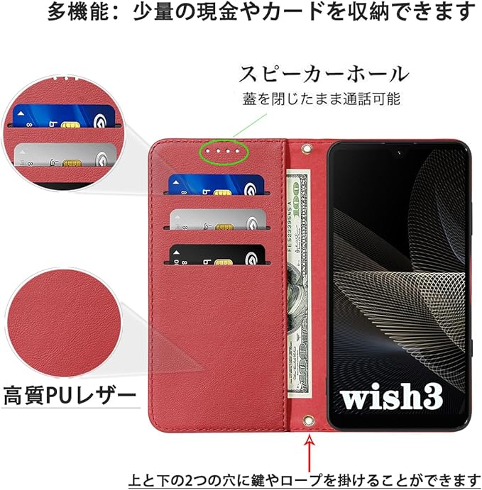 AQUOS Wish 3 ケース 手帳型 高質レザー AQUOS Wish 3 ケース 手帳型 SH-53D ケース A302SH 携帯カバー 皮革 Wish 3 ケース 耐衝撃 内蔵マグネット開閉式 ベルトなし スマホケース おしゃれ カードポケット スタンド機能 便利 スプラット同梱 携帯ケース レッド