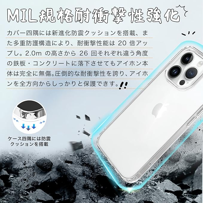 【耐衝撃性強化】四角内部に防振クッションを搭載され、四角外部には物理耐衝撃構造設置することで、衝撃吸収性能を倍アップ側面から落下しても角落ちしてもPhone をしっかりと守れます。2.0mの高さから26回それぞれ違う角度の鉄板・コンクリートに落下させても携帯電話本体は完全に無傷。圧倒的な耐衝撃性を誇り、15 プロ マックスを全方向からしっかりと保護できす。