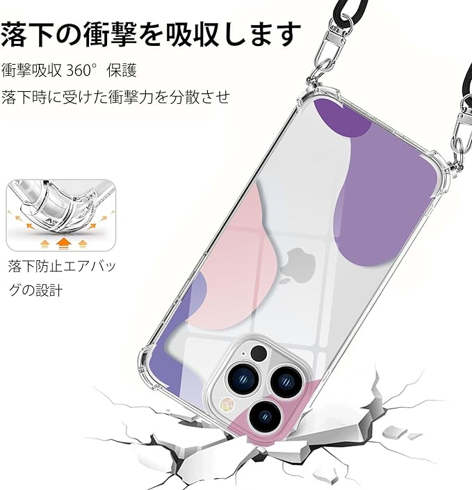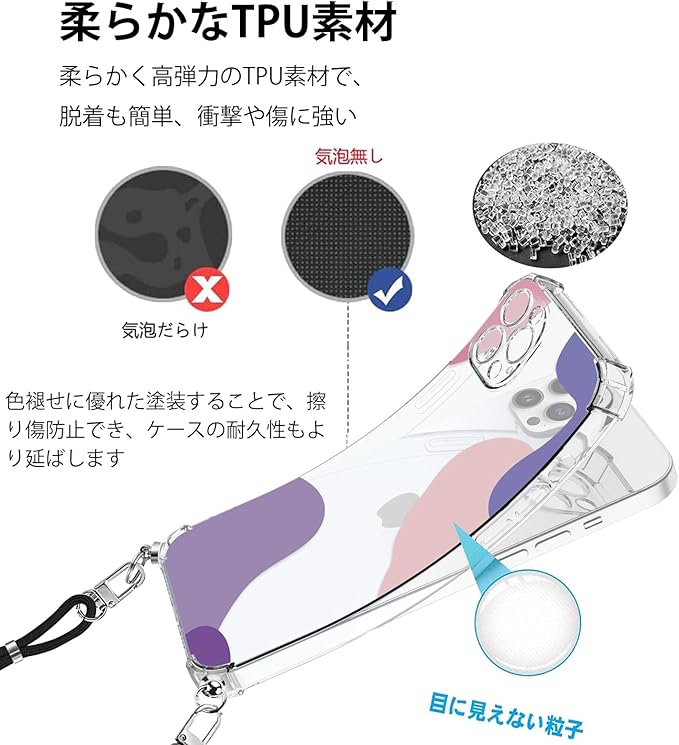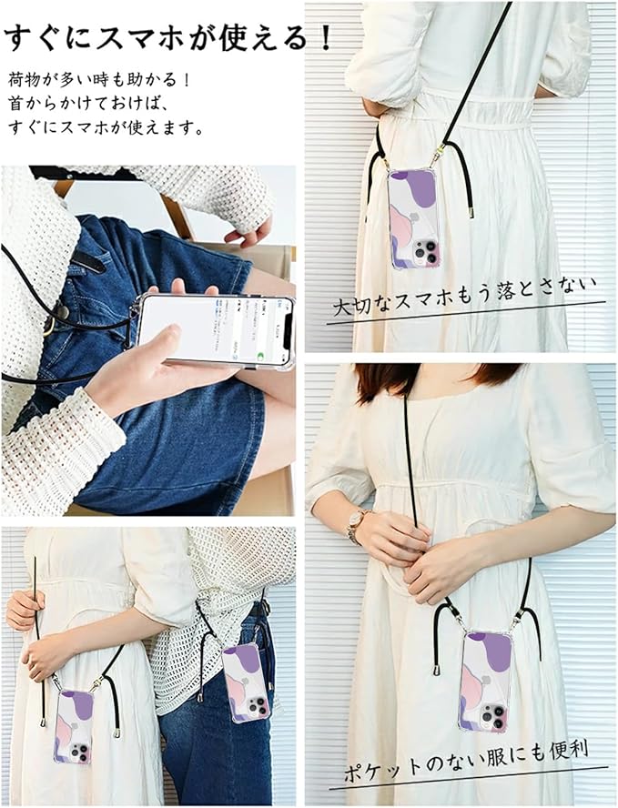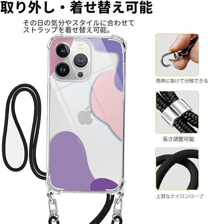 iPhone 15 Pro 用 ケース クリア 調節可能な ショルダー iPhone15 Pro スマホケース 肩掛け 首掛け 斜めかけケース おしゃれ かわいい 韓国 透明 TPU ストラップ付き 薄型軽量 耐衝撃 全面保護 落下防止 可愛い ニュアンスネイル風 アイフォン 15Pro 用 携帯カバー(パープル)