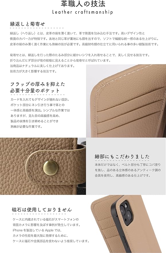 HANATORA iPhone12 ケース 手帳型 本革 スマホケース スマホ スタンド ストラップ 付き シュリンクカーフレザー ギフト ベルトあり マグネットなし グレージュ H0XB-12-Grege