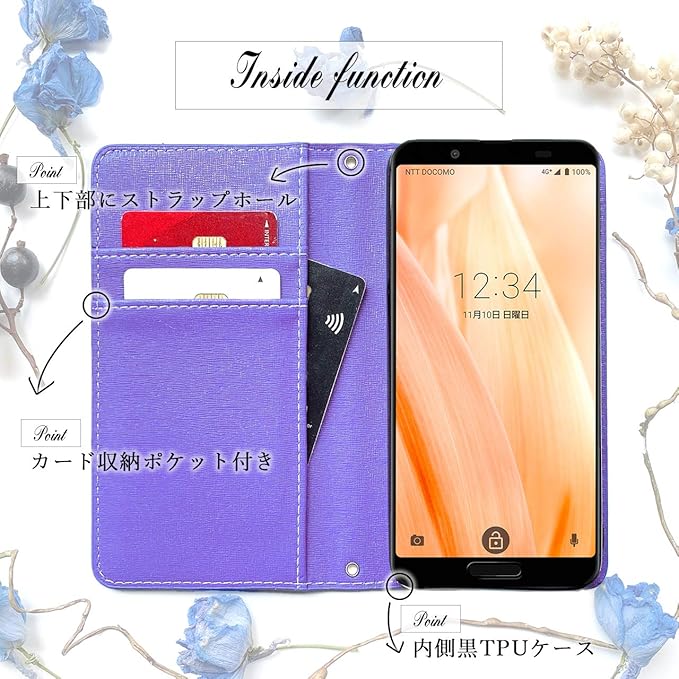 704SH シンプルスマホ4 ケース カバー 手帳型 スマホケース シンプルスマホ4ケース シンプルスマホ4カバー 704shケース 704shカバー 手帳型ケース 手帳型カバー 手帳 スタンド機能 上質 PUレザー サフィアーノ 型押し 黒tpu 【NB】 ブルーベリー