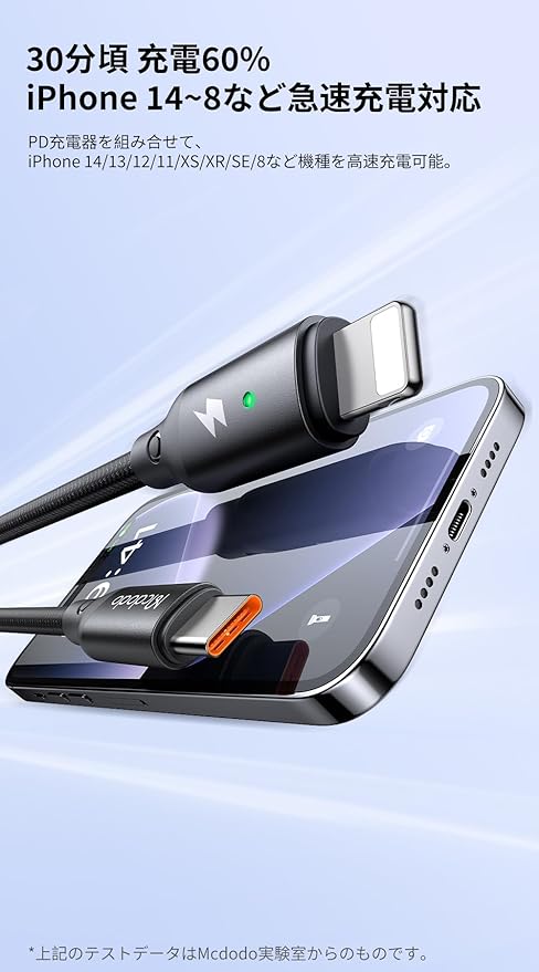 【30分頃 充電60%、iPhoneデバイス急速充電対応】:PD充電器を組み合せて、iPhone 14/13/12/11/XS/XR/SE/8など機種を高速充電可能。※上記のテストデータはMcdod