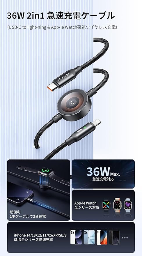 Mcdodo 36W 2in1 急速充電ケーブル USB-C to light-ning & App-le Watch磁気ワイヤレス充電ケーブル PD対応 Type-C ライトニングケーブル ウォッチ用マグネット充電コード App-le Watch全シリーズ対応 i-Phone 14/13/12/11/XS/XR、i-Pad/AirPodsなどiOS端末 1.5m