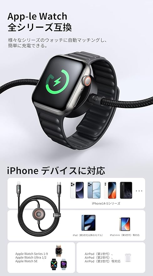 【2in1 USB-C to light-ning & App-le Watch磁気ワイヤレス充電ケーブル】:超便利、1本ケーブルで2台充電。36W Max.、急速充電対応。App-le Watch、全シリーズ対応。iPhone 14/13/12/11/XS/XR/SE/8、ほぼ全シリーズ高速充電。