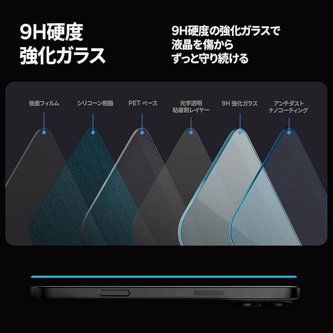 [9H強化ガラス]加熱処理で、表面に圧縮応力を発生させ(Na+とK+イオン交換による科学強化)、万が一傷ができても追加的な破損を防ぎます。加えて、9H強化ガラスを採用し、