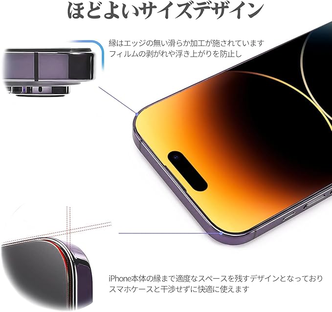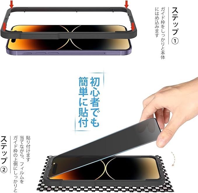 ①【対応機種】iPhone 14promax(アイフォン14 プロマックス) 6.7インチ用。同梱物:28°覗き見防止強化ガラスフィルム2枚、レンズ保護フィルム 2枚 、ガイド枠1個 、滑り止めマット*1、取扱説明書。商品は一枚一枚手作業で検査しましたので、品質は非常に安定しております、ご安心して弊社の製品をお買い求めください。