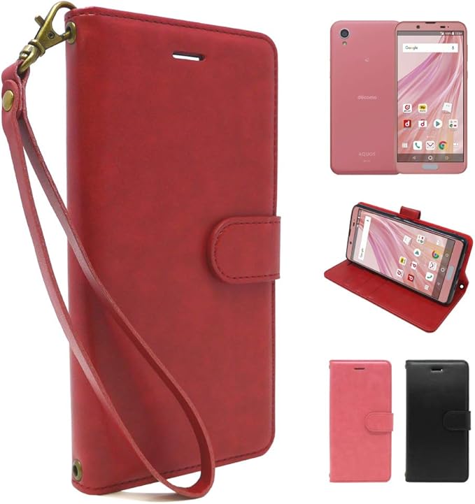 シズカウィル AQUOS sense2 au SHV43 docomo SH-01L simフリー SH-M08 手帳型 PUレザー ケース カバー ビンテージストラップ付 カード収納あり スマホケース RED QUEEN