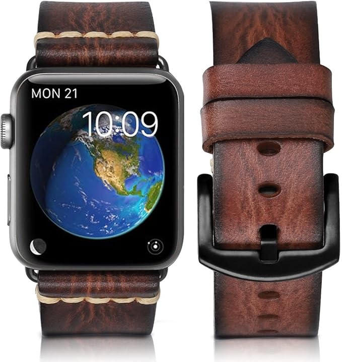 [HUAFIY] 互換のAppleWatchバンド 42mm 44mm 45mm46mm49mm レザーストラップ交換用ストラップiWatchシリーズ 10/9/8/7/6/5/4/3/2/1、スポーツバージョン。2024年の新しい手磨きレザー (該当する42mm44mm45mm46mm49mm, ブラウンストラップ/ブラッククラスプ)