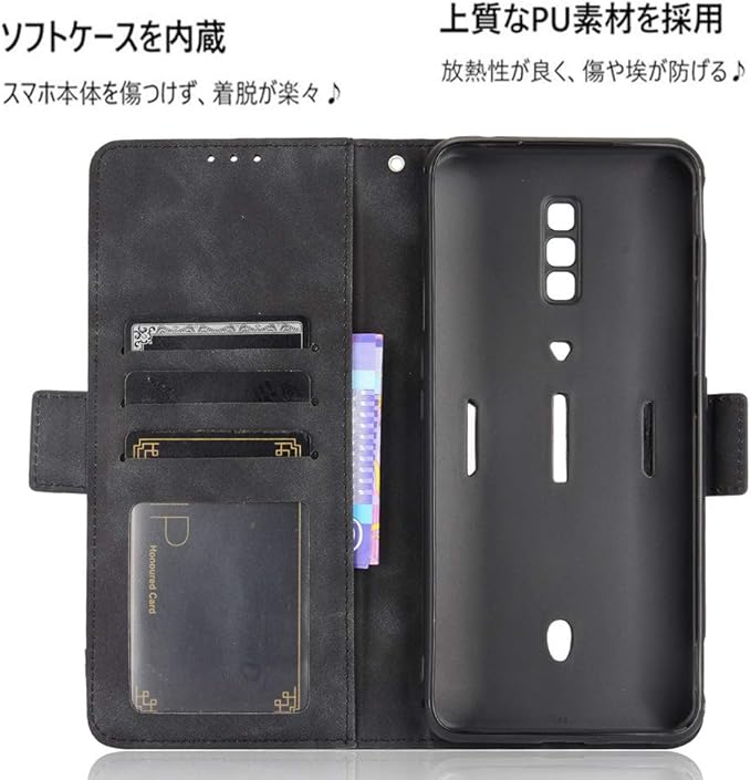 商品の特性1: 裏はTPU素材、表面はPUレザー製ですから。外側には手触りの良く、滑り止めレザーを採用し、衝撃吸収と汚れ防止ができます。内側には柔らかなTPUカバーを使用し、大切なNubia RedMagic 6 / 6 Proを傷や衝撃から守ってくれます。名刺とカードなどを収納することができて、持ち歩きに便利です。
