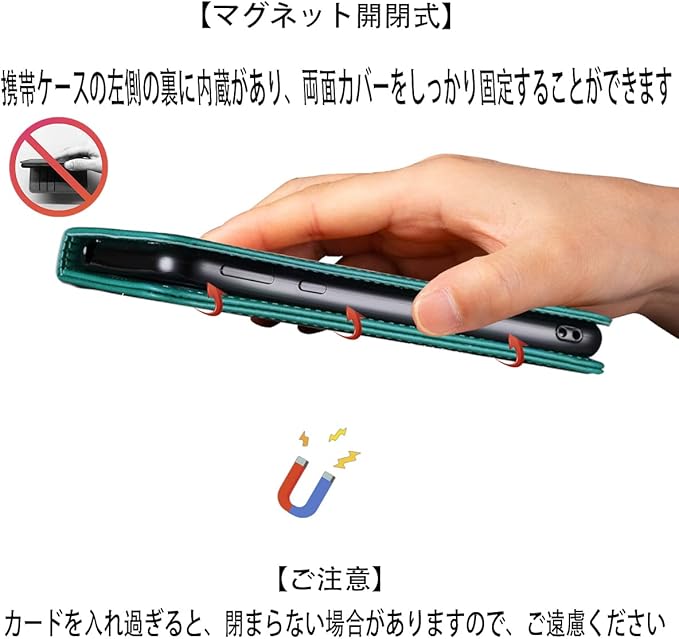【カードポケット付き】:財布型ケースとして、名刺やお札などを入れるカードポケットがつき、ちょっとしたお出かけにもスマホケース一つでOK日常生活に便利です。ただし、カードを入れ過ぎ