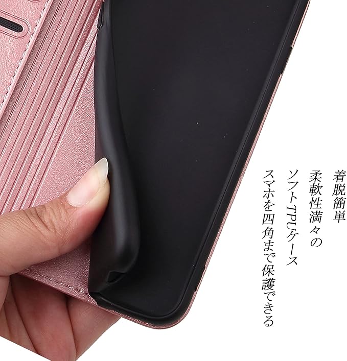 ?【素材改良】本商品の外部カバーは牛革繊維を人工合成という生産プロセスで仕上げられた合革で、普通の合革より、性能上の 耐熱性、耐摩擦が一層アップされた。表面生地が硬すぎず、やわすぎず、ちょっと良い手触りです。手汗が出てきても滑りにくく、ケースにも変な匂いがございません。インなケースは弾力性のあるソフト素材を採用しており、四角までしっかり保護でき、実用性高い手帳型です。