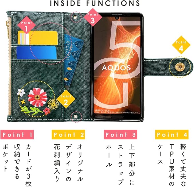 シンプルスマホ6 A201SH 専用 手帳型ケース。小銭や免許証等の収納に便利なファスナー付きの手帳型ケースです。上品なサフィアーノ生地に、色鮮やかな花柄の刺繍を施しています。