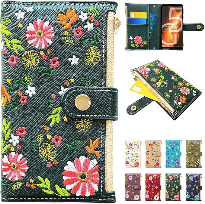 シンプルスマホ7 A404SH シンプルスマホ6 A201SH 用 ケース カバー 手帳型 手帳型ケース A201SHケース A201SHカバー シンプルスマホ6ケース シンプルスマホ6カバー シンプルスマホ 6 スマホケース スマホカバー おしゃれ花刺繍 ダークグリーン