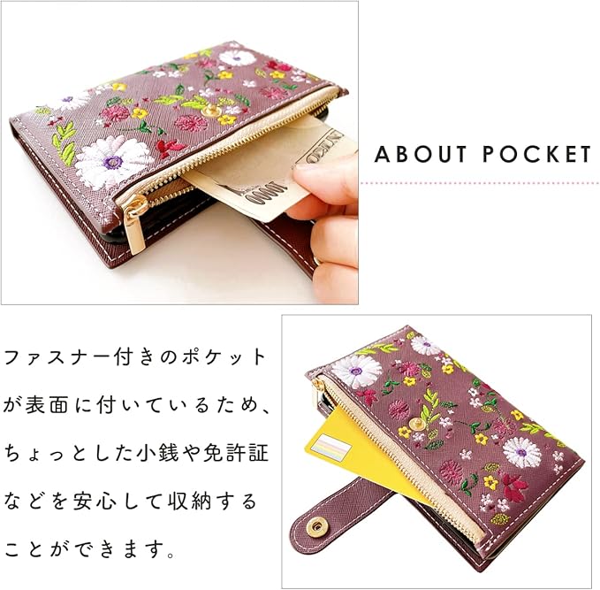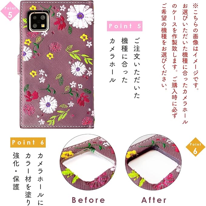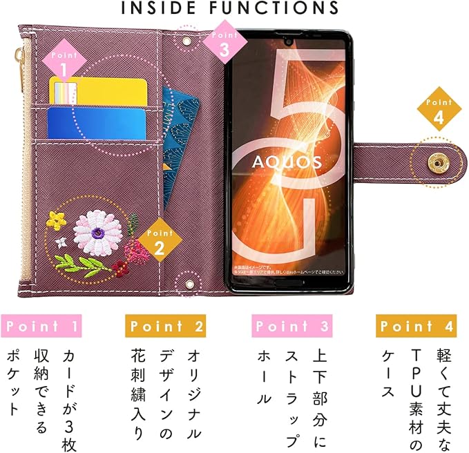 シンプルスマホ6 A201SH 専用 手帳型ケース。小銭や免許証等の収納に便利なファスナー付きの手帳型ケースです。上品なサフィアーノ生地に、色鮮やかな花柄の刺繍を施しています。