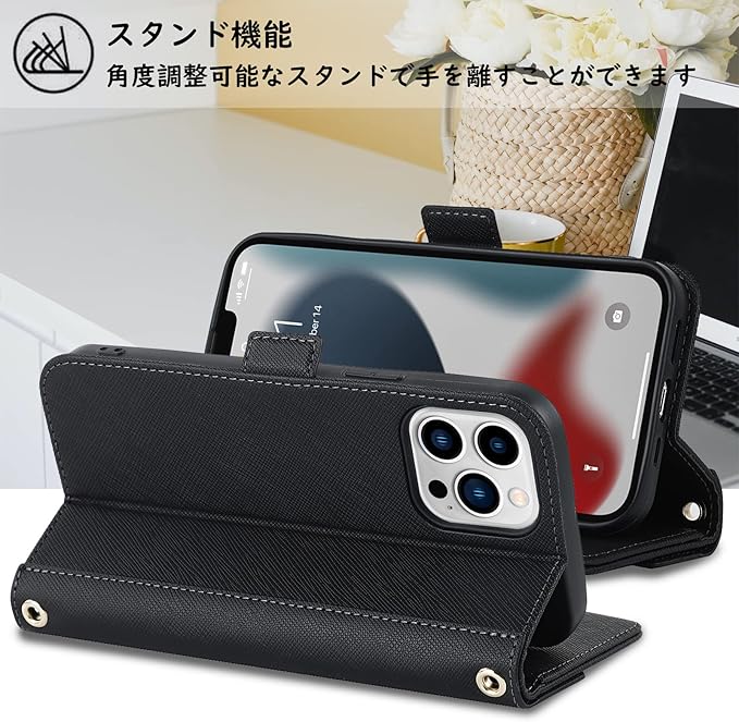 【Hamany】 いphone13 pro ケース ショルダー 鏡 iphone 13 pro ケース 手帳型 ストラップ付き ミラー アイホン13プロケース カード収納 財布 クロスボディケース 肩がけ 首掛け 斜め掛け スマホカバー iphone 13プロ 耐衝撃 レザー カバー -黒