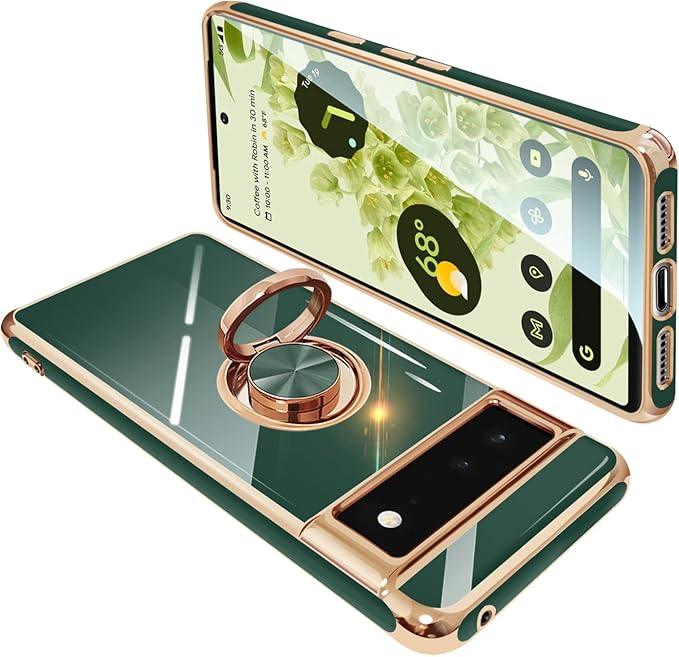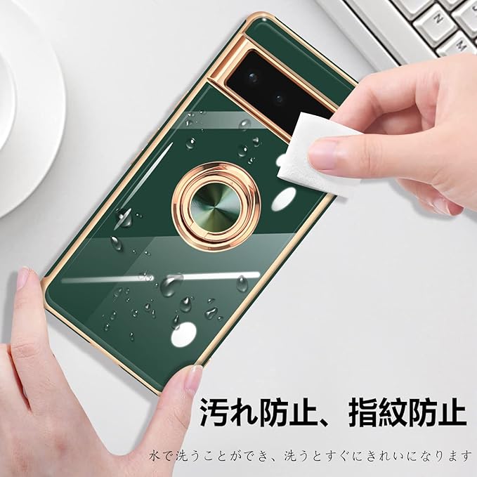 Google Pixel6 ケース リング付き グーグル ピクセル 6 リング カバー 耐衝撃 TPU メッキ加工 360 回転 スタンド機能 車載ホルダー ストラップホール付き(ダークグリーン)