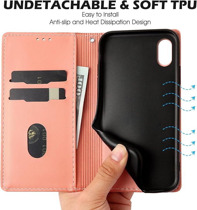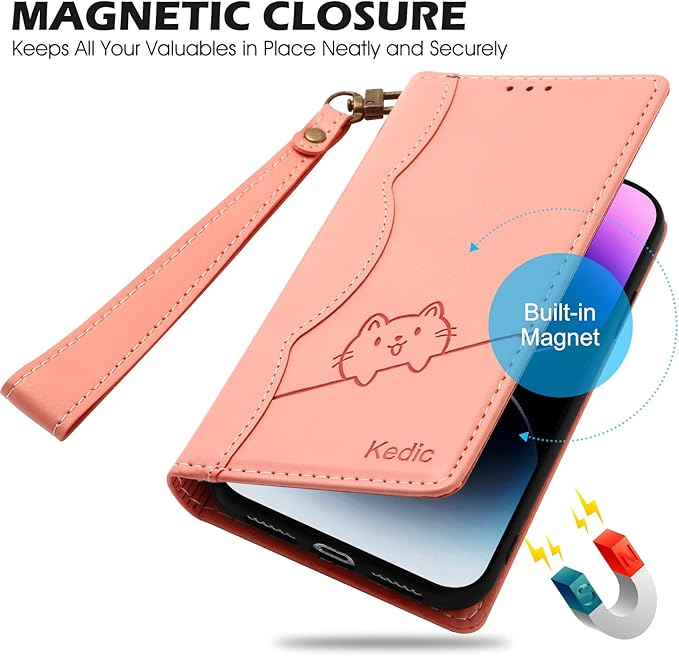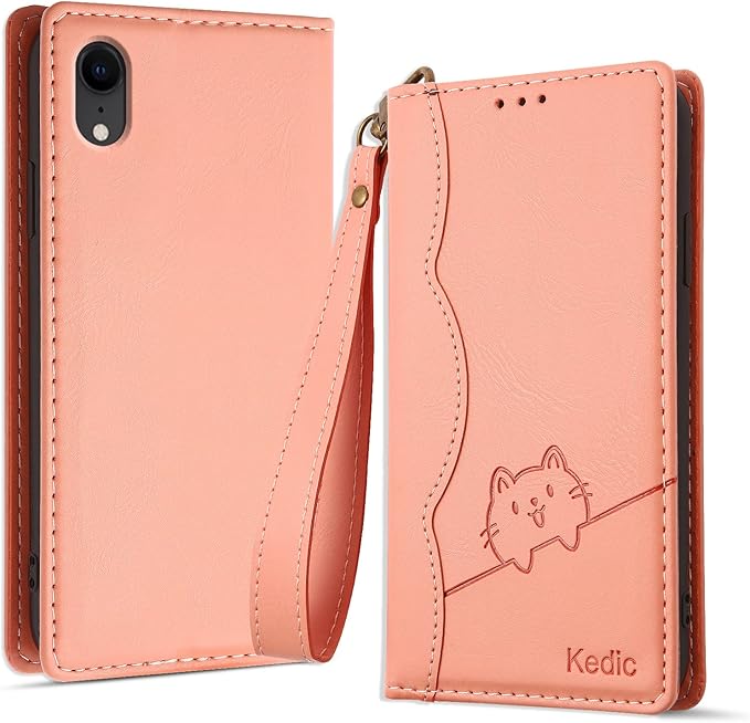 Kedic iPhone XR ケース 手帳型 アイフォンXR ケース 可愛い笑顔の猫模様 手作り iPhoneXR 携帯カバー iPhonexrスマホケース手帳型 おしゃれ カード入れ 財布型 と横方向のスタンドが 多機能 アイフォン XR カバー 内蔵マグネット式 純色シンプルデザイン iPhone XR 手帳型ケース ピンク
