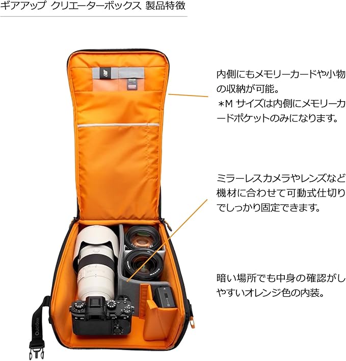 【大きく開く収納スペース】収納例:標準ズームレンズ付きミラーレスカメラ+交換用レンズ2本+アクセサリーを収納可能