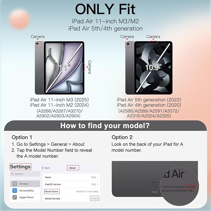 注:iPad 10 (10.9インチ、2022モデル)、iPad Pro 11インチ M4 (2024)には対応できません。iPad Air 11 インチ M3/M2 (2025/2024)、iPad Air5/4 (10.9インチ、2022/2020モデル、第5/4世代)用の特別デザインです。Pencil Pro/Pencil(USB-C)に対応できます。対応モデル:A2902 A2903 A2904 A2588 A2589 A2591 A2324 A2072 A2316 A2325。ご購入の