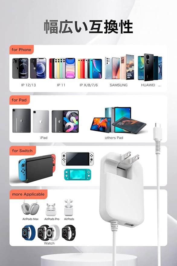 【PD30W&QC3.0の高速充電対応】単独USB-Cケーブルを使う場合、最大PD30W で一部分の30W Macbook air、スマホやタブレットなどの急速充電できます。一般的な5W出力の充電器に比べ、約数倍上がり、充電時間を大幅に短縮します。QC 3.0対応USB-Aポートを単独の使用すると最?18Wまで急速充電を可能です。ご注意:2つのポートを同時に充電する時、合計20Wと共有しますので、PDとQC急速充電