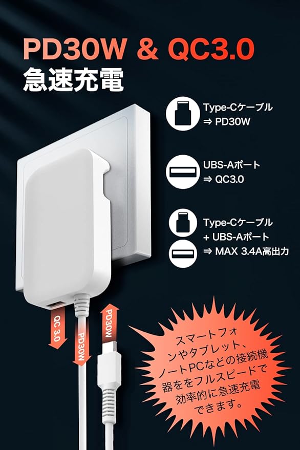 【新版】USB充電器 PD30W 急速充電器 Type-C 充電器 タイプc GaN30w(PD30W&QC3.0/Type-Cケーブル&USB A/PSE認証/16mm超薄型)スマホ充電器 折りたたみ式プラグ 2つ同時充電 ACアダプター コンセント iPhone15 Pro/Galaxy/Android/Switchその他 USB-C/USB-A各種機器対応