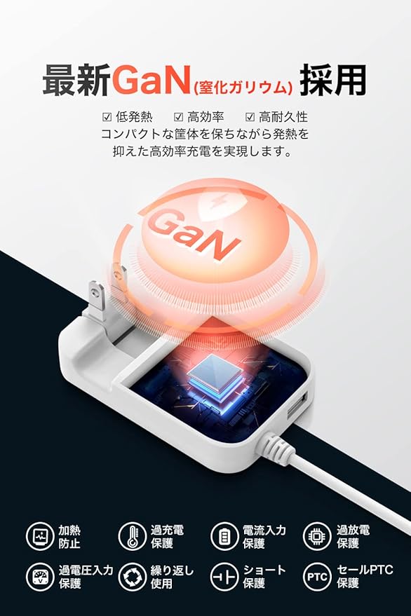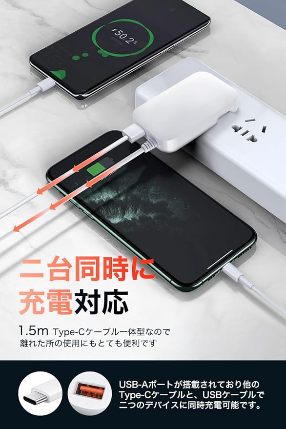 【ケーブル一体型USB-C充電器】Type Cケーブル一体型でACアダプタがついているため、バッテリーがなくなってしまった場合すぐに充電ができます。USB Type-CケーブルとUSB-Aポートの合計2つ出力を搭載し、GaN(窒化ガリウム)を採用した小型で軽量、かつ高出力なUSB AC充電器です。