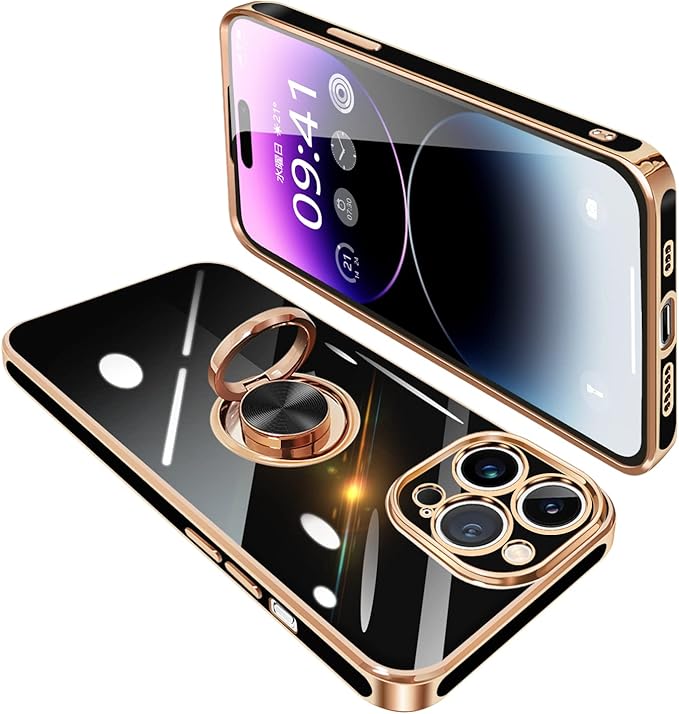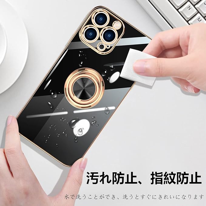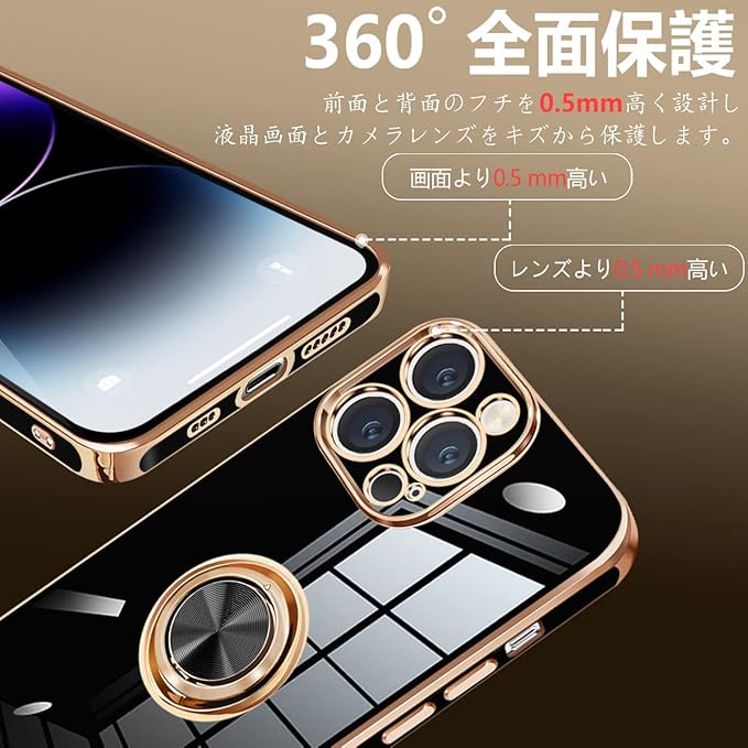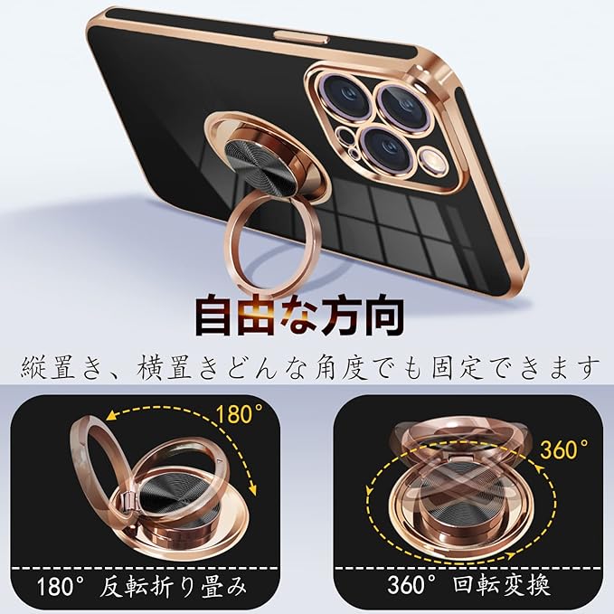 iPhone14 Pro ケース リング付き アイフォン14Pro リング カバー 耐衝撃 TPU 360 回転 スタンド機能 メッキ加工 車載ホルダー ストラップホール付き 6.1インチ(ブラック)